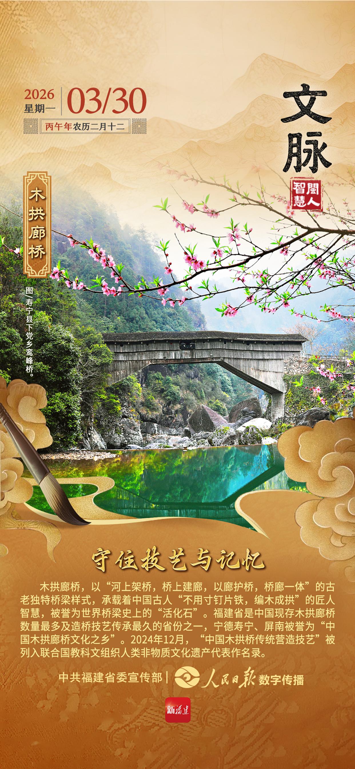 木拱廊桥,以“河上架桥,桥上建廊,以廊护桥,桥廊一体”的古老独特桥梁样式,承载着中国古人“不用寸钉片铁,编木成拱”的匠人智慧,被誉为世界桥梁史上的“活化石”。福建省是中国现存木拱廊桥数量最多及造桥技艺传承最久的省份之一,宁德寿宁、屏南被誉为“中国木拱廊桥文化之乡”。2024年12月,“中国木拱桥传统营造技艺”被列入联合国教科文组织人类非物质文化遗产代表作名录。