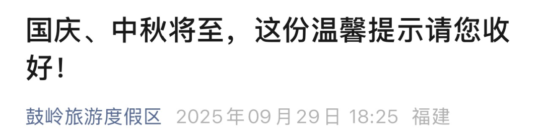 29日,福州鼓岭旅游度假区、鼓山旅游景区发布国庆、中秋假期温馨提示↓