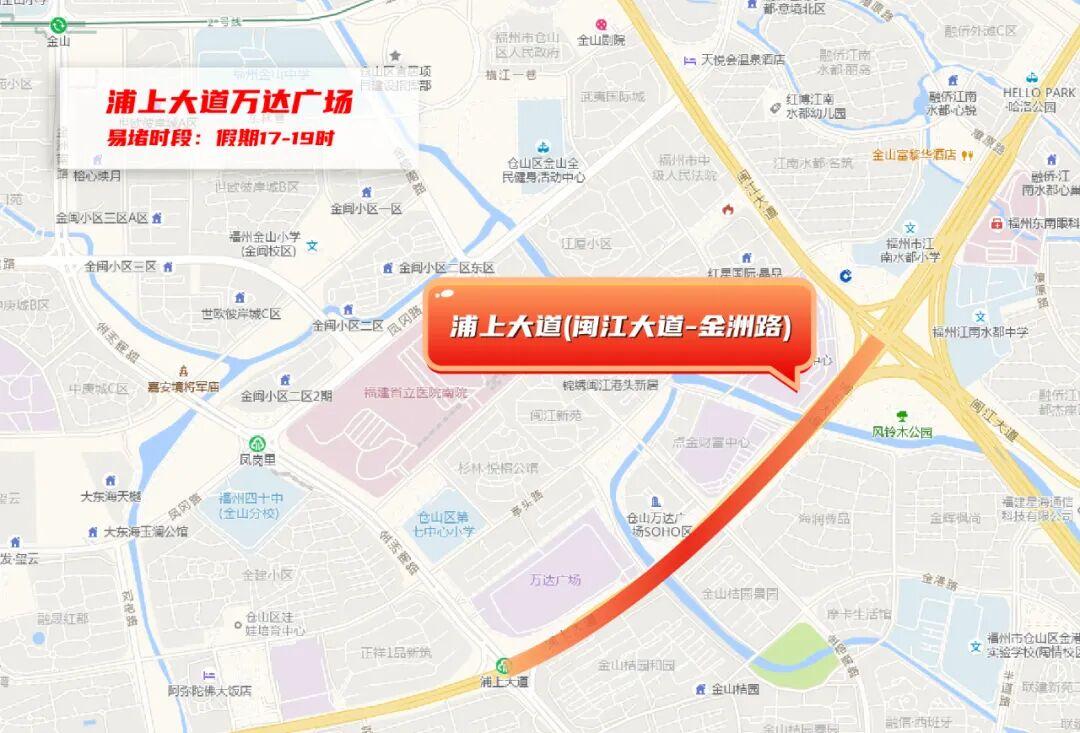 易堵路段为浦上大道(闽江大道—金洲路),易堵时段为假期17—19时,高峰通行速度预计为30公里/小时,交通状态达到拥堵。该路段拥堵时,易发生交通事故,请大家途经时注意控制车速,保持车距,谨慎驾驶。