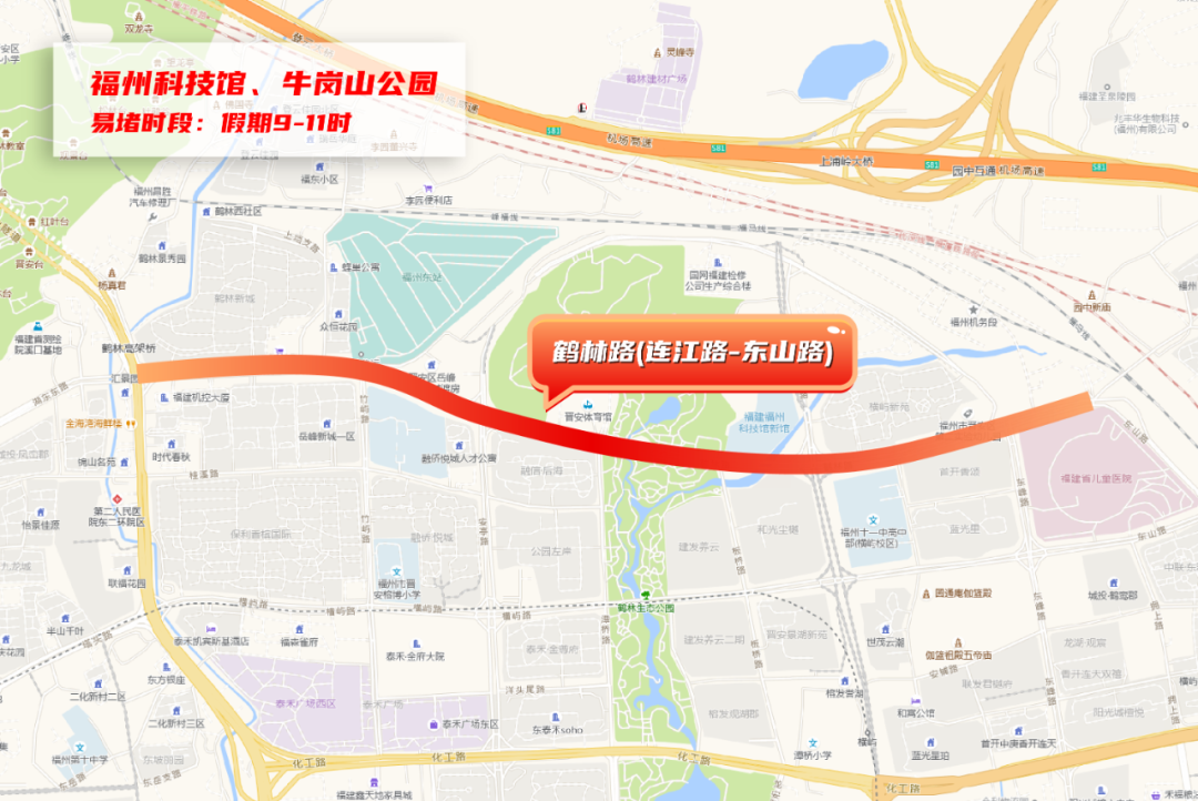 易堵路段为鹤林路(连江路—东山路),易堵时段为假期9—11时,高峰通行速度预计为30公里/小时,交通状态达到严重拥堵。