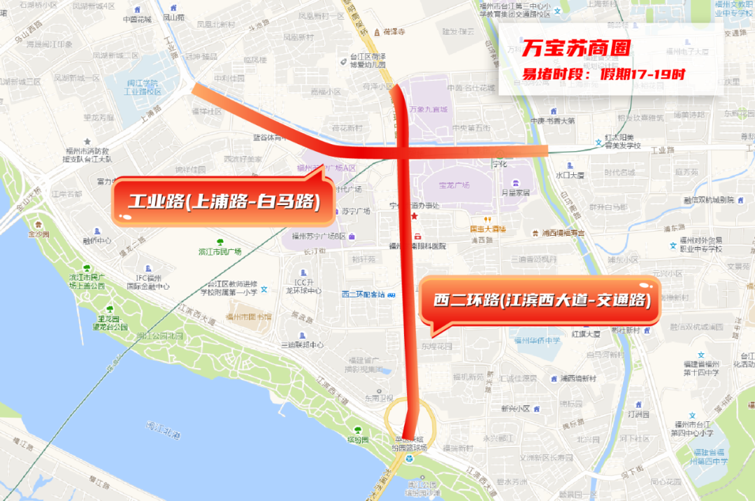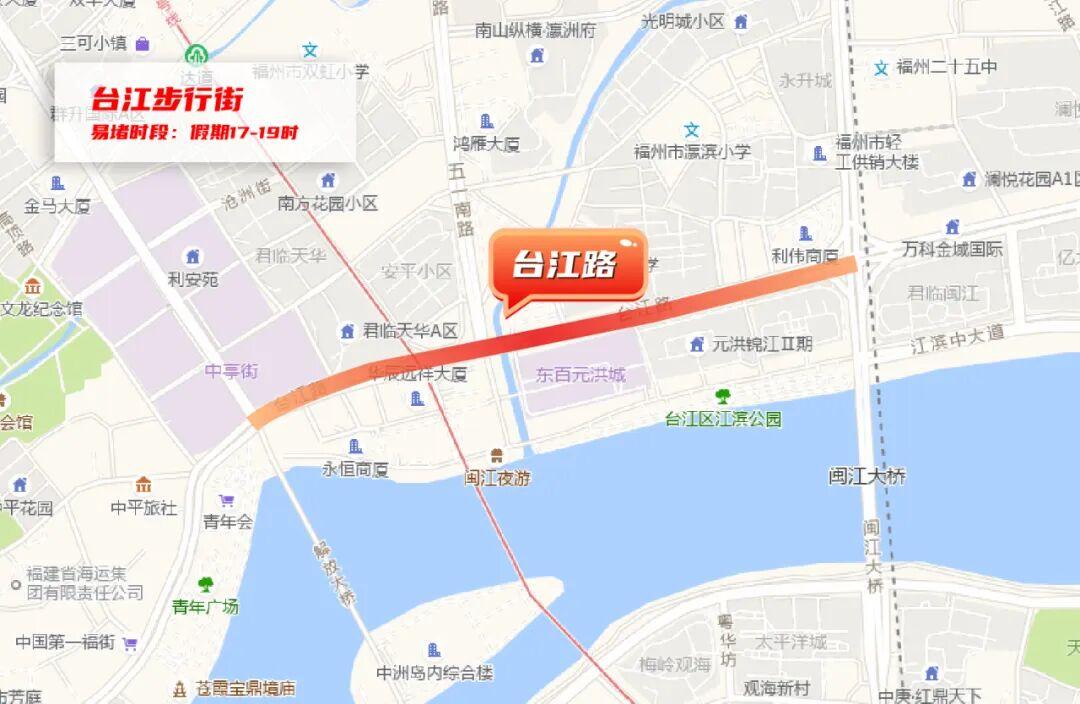 易堵路段为台江路,易堵时段为假期17—19时,高峰通行速度预计为20公里/小时,交通状态达到拥堵。