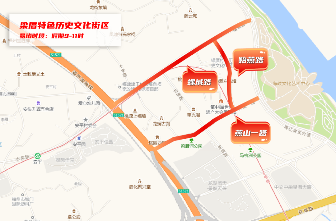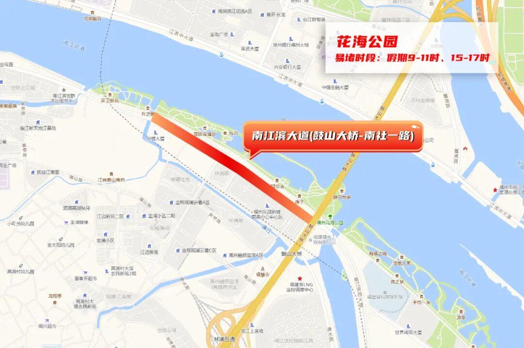 易堵路段为南江滨大道(鼓山大桥—南社一路),易堵时段为假期9—11时、15—17时,高峰通行速度预计为40公里/小时,交通状态达到严重拥堵。