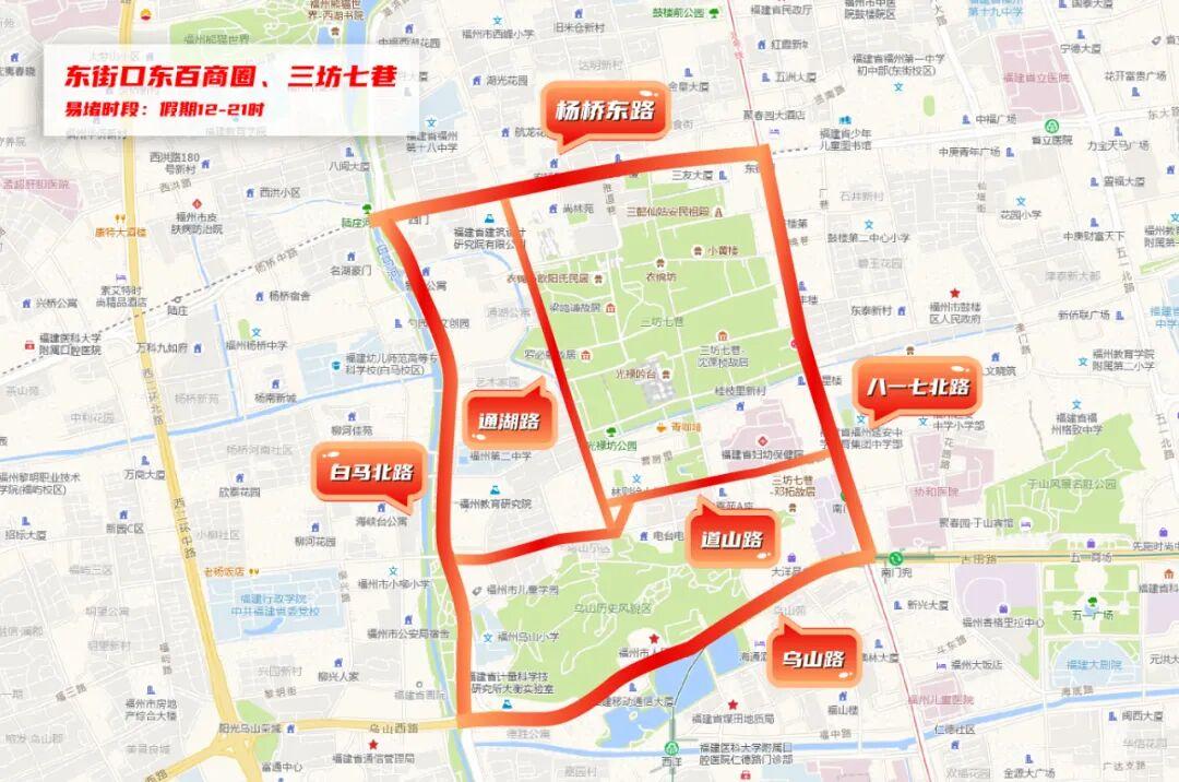 1—2日景区周边道路交通流量较平时显著上升,其中三坊七巷、烟台山公园等周边道路12—21时较易发生拥堵;森林公园、儿童公园、梁厝等周边道路9—11时较易发生拥堵;鼓山、鼓岭等周边道路9—11时、14—17较易发生拥堵;花海公园、农大沙滩公园等周边道路9—11时、15—19时较易发生拥堵。1—2日重点商圈周边道路交通流量较平时高峰期小幅上升,每日17—19时较易发生拥堵。