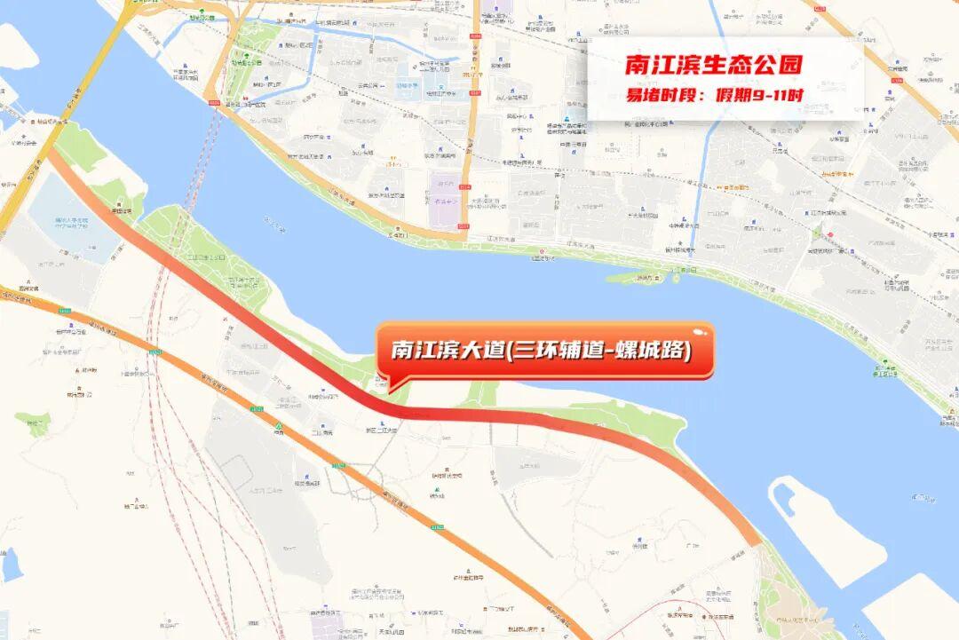 易堵路段为南江滨大道(三环辅道—螺城路),易堵时段为假期9—11时,高峰通行速度预计为30公里/小时,交通状态达到拥堵。