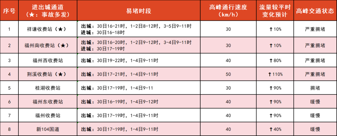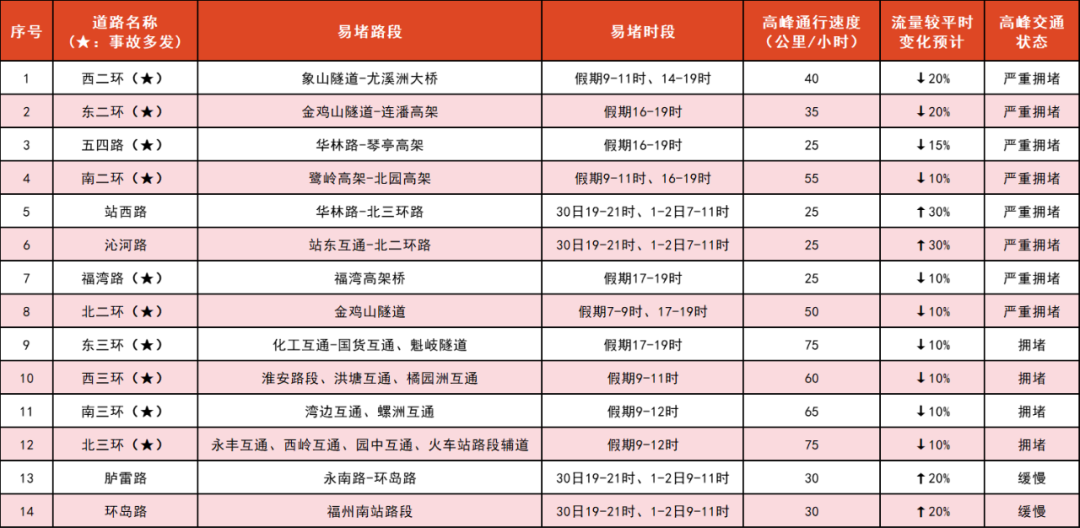 主要进出城通道交通流量预计较平时上升30%,其中出城方向交通流量较平时上升35%,出城高峰时段为30日16—21时,1—2日8—12时,拥堵路段集中在祥谦(螺洲互通、龙翔岛、五虎山隧道)、福州南(双湖互通、湾边互通、湾边大桥南桥头)、福州西(建平路)、荆溪(西岭互通—荆溪连接线光明匝道口)、桂湖(贵新隧道);进城方向交通流量较平时上升25%,进城高峰时段为30日17—19时,拥堵路段集中在祥谦、福州南方向。