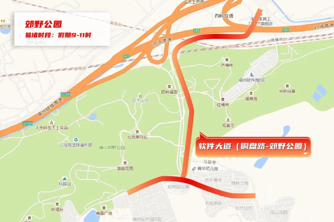 易堵路段为软件大道(铜盘路—郊野公园),易堵时段为假期9—11时,高峰通行速度预计为35公里/小时,交通状态达到拥堵。