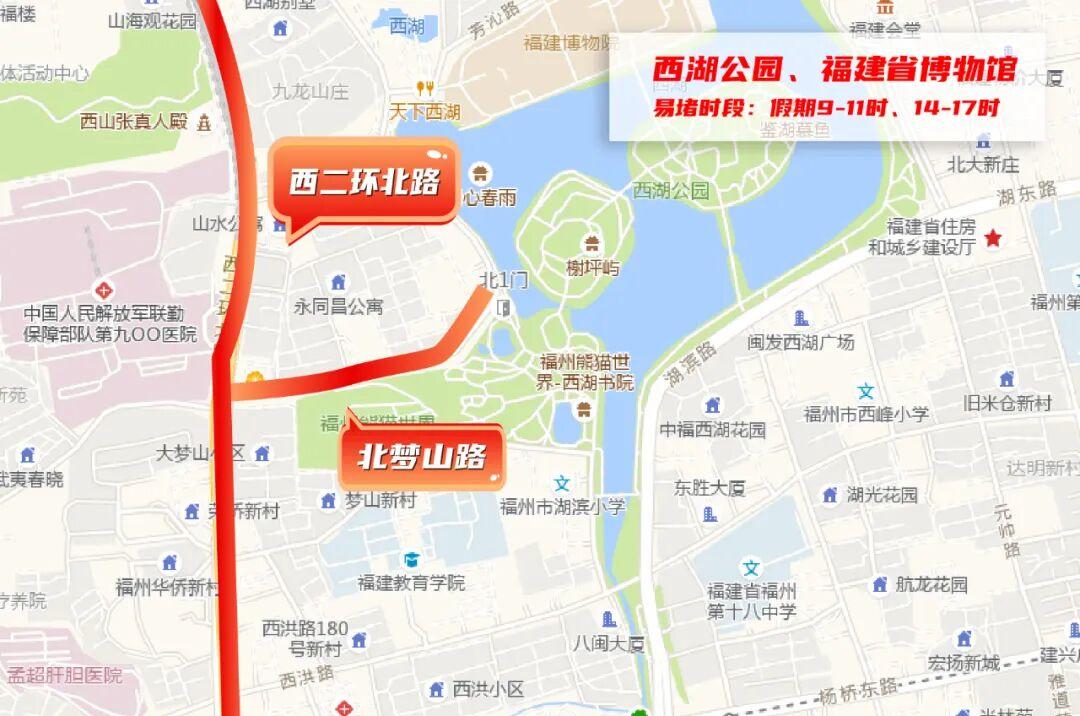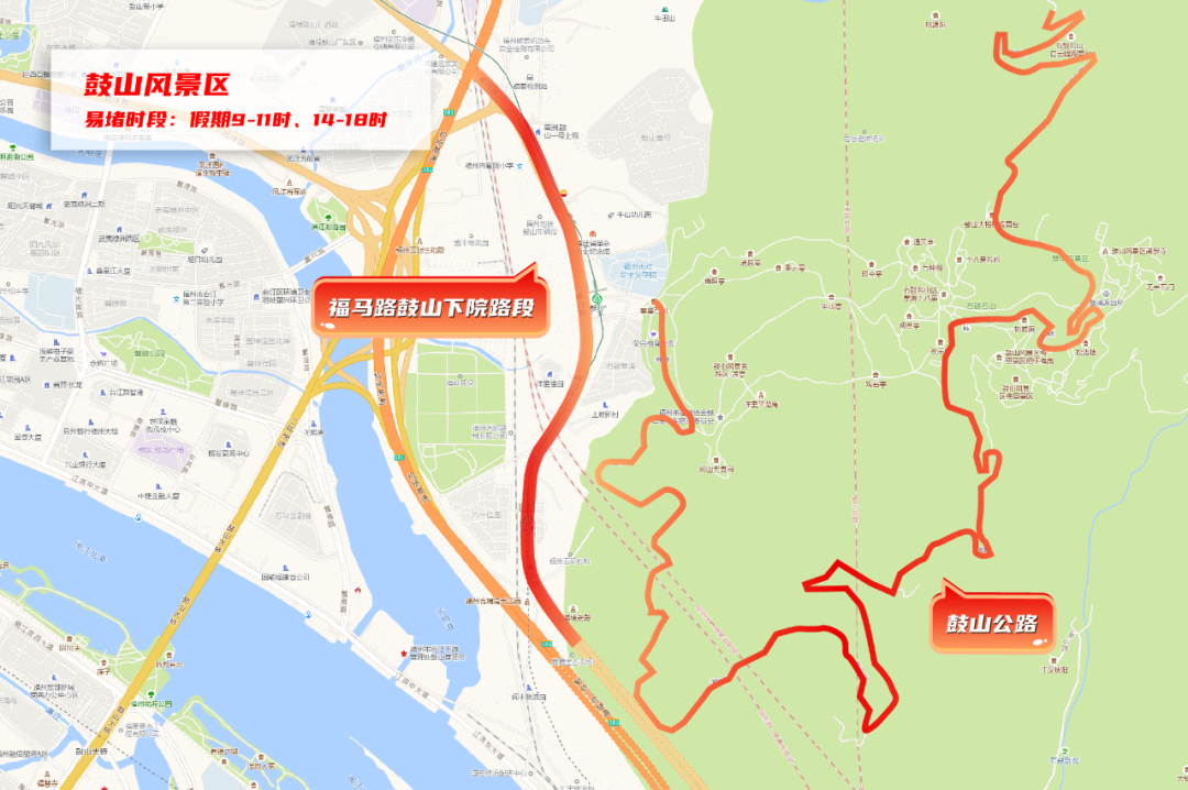 易堵路段为福马路鼓山下院路段、鼓山公路,易堵时段为假期9—11时、14—18时,高峰通行速度预计为20公里/小时,交通状态达到严重拥堵。
