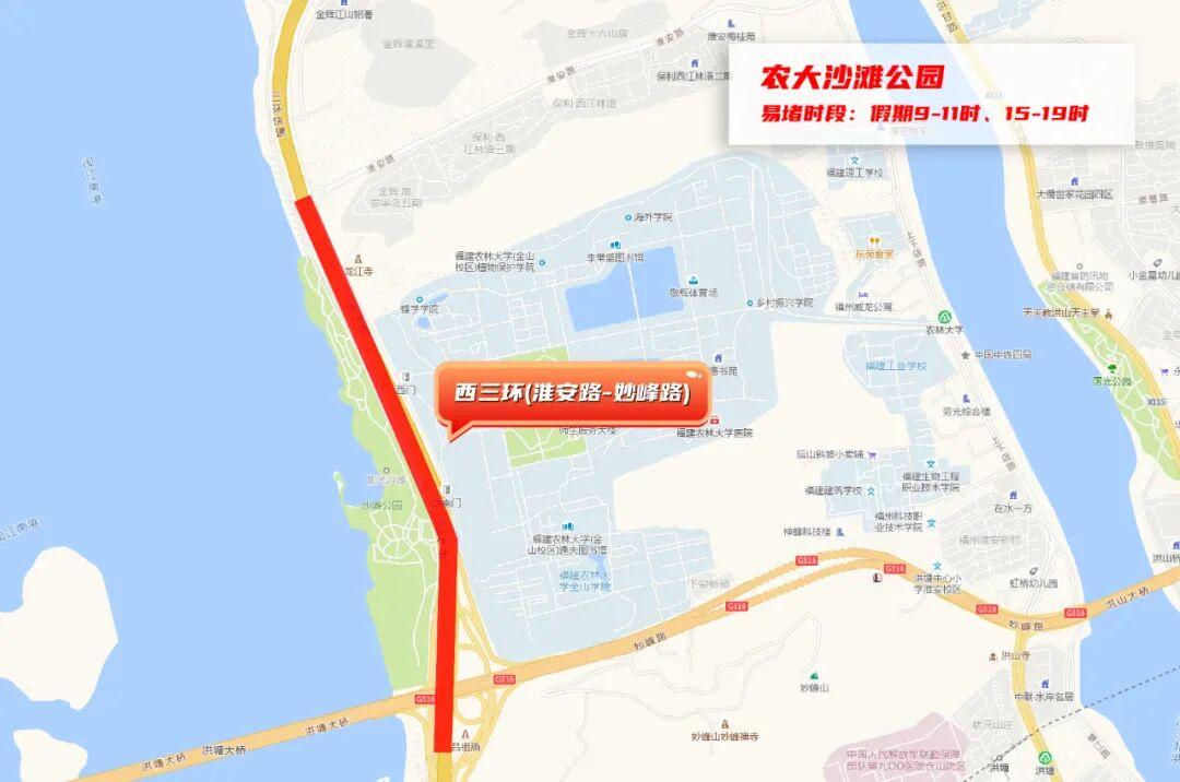 易堵路段为福飞北路(审知路—莲花峰路)、审知路、新园路、赤桥路,易堵时段为假期9—11时,高峰通行速度预计为20公里/小时,交通状态达到严重拥堵。