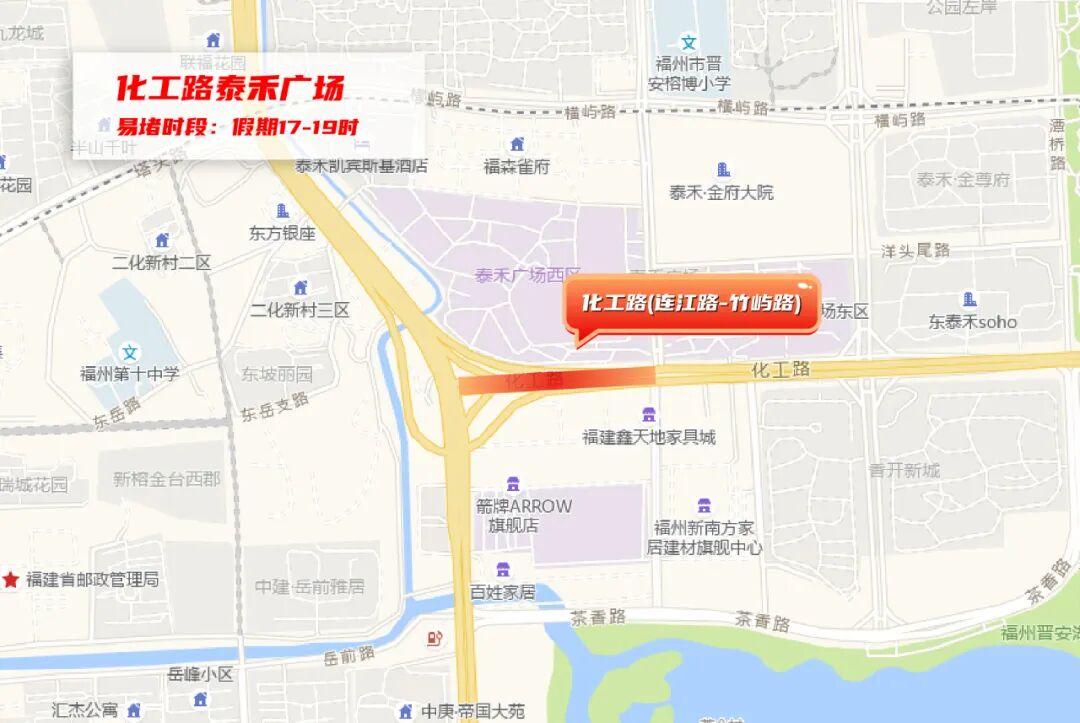 易堵路段为化工路(连江路—竹屿路),易堵时段为假期17—19时,高峰通行速度预计为35公里/小时,交通状态达到拥堵。该路段拥堵时,易发生交通事故,请大家途经时注意控制车速,保持车距,谨慎驾驶。