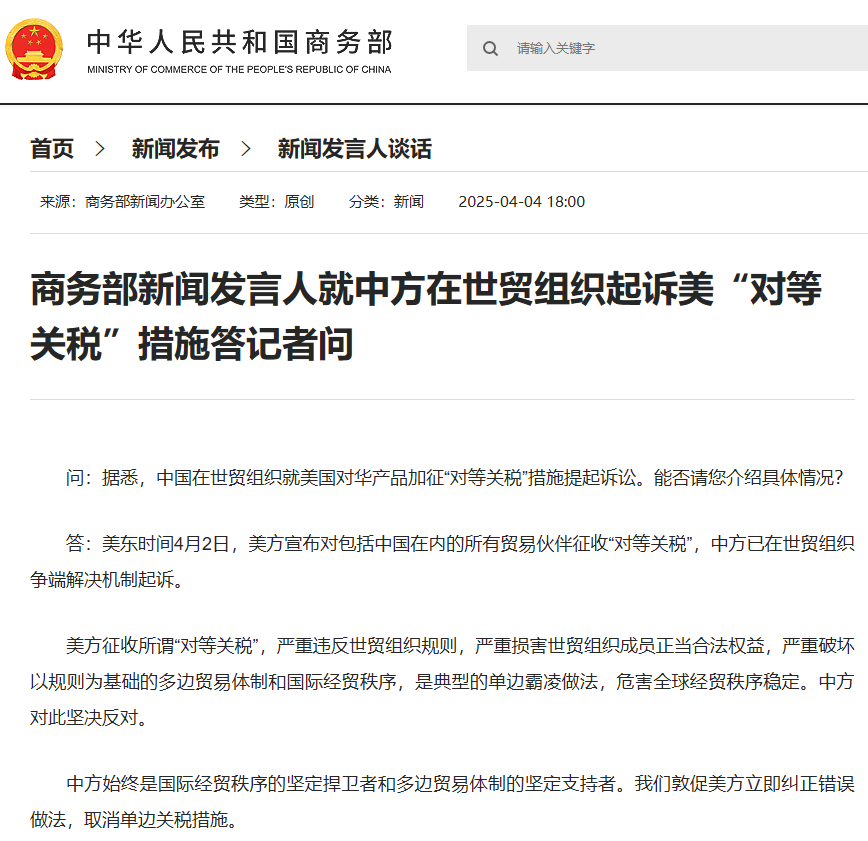 4月4日,商务部新闻发言人就中方在世贸组织起诉美“对等关税”措施答记者问。