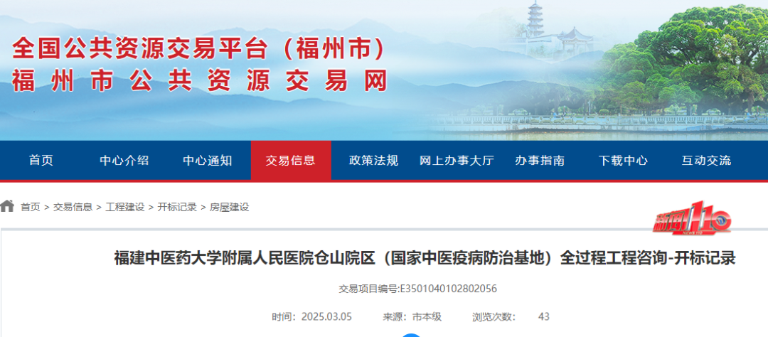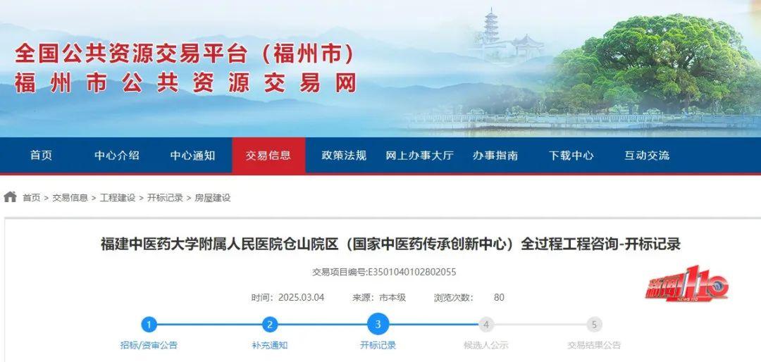 3月4日起,福州市公共资源交易网连续发布福建中医药大学附属人民医院仓山院区两个国家级项目(国家中医药传承创新中心国家中医疫病防治基地)的开标记录。