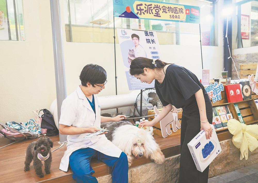 8月,福州市烟台山街区开启为期一个月的“毛孩子夜游计划”。活动期间,烟台山将陆续举办宠物市集、宠物领养、宠物交友运动会、宠物主题艺术展等活动,并持续增加“宠物友好”商户名单。图为8月3日,烟台山宠物市集上,福州一家宠物医院在此摆摊宣传。(记者 施辰静 摄)