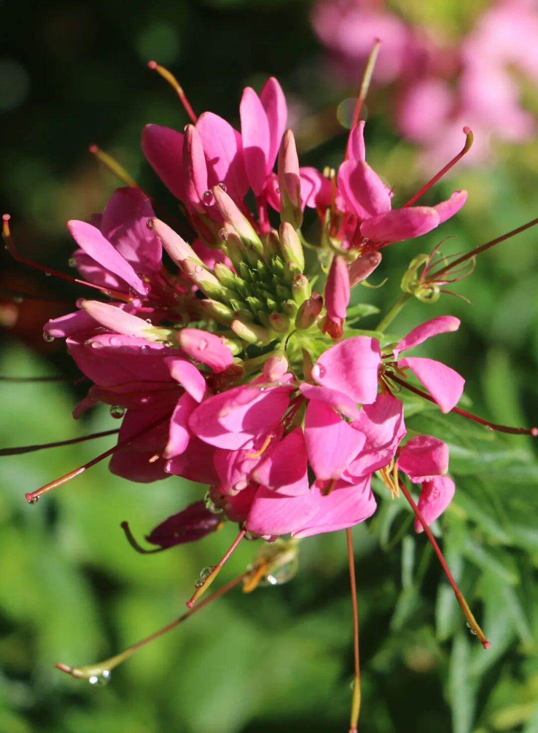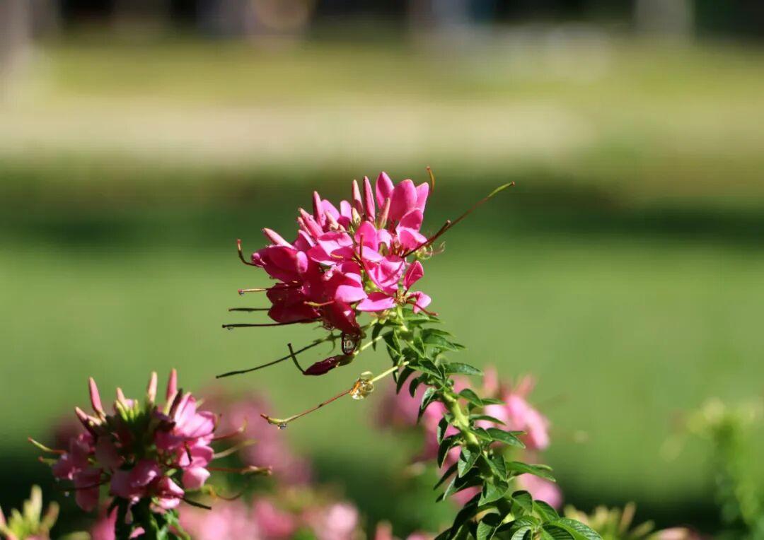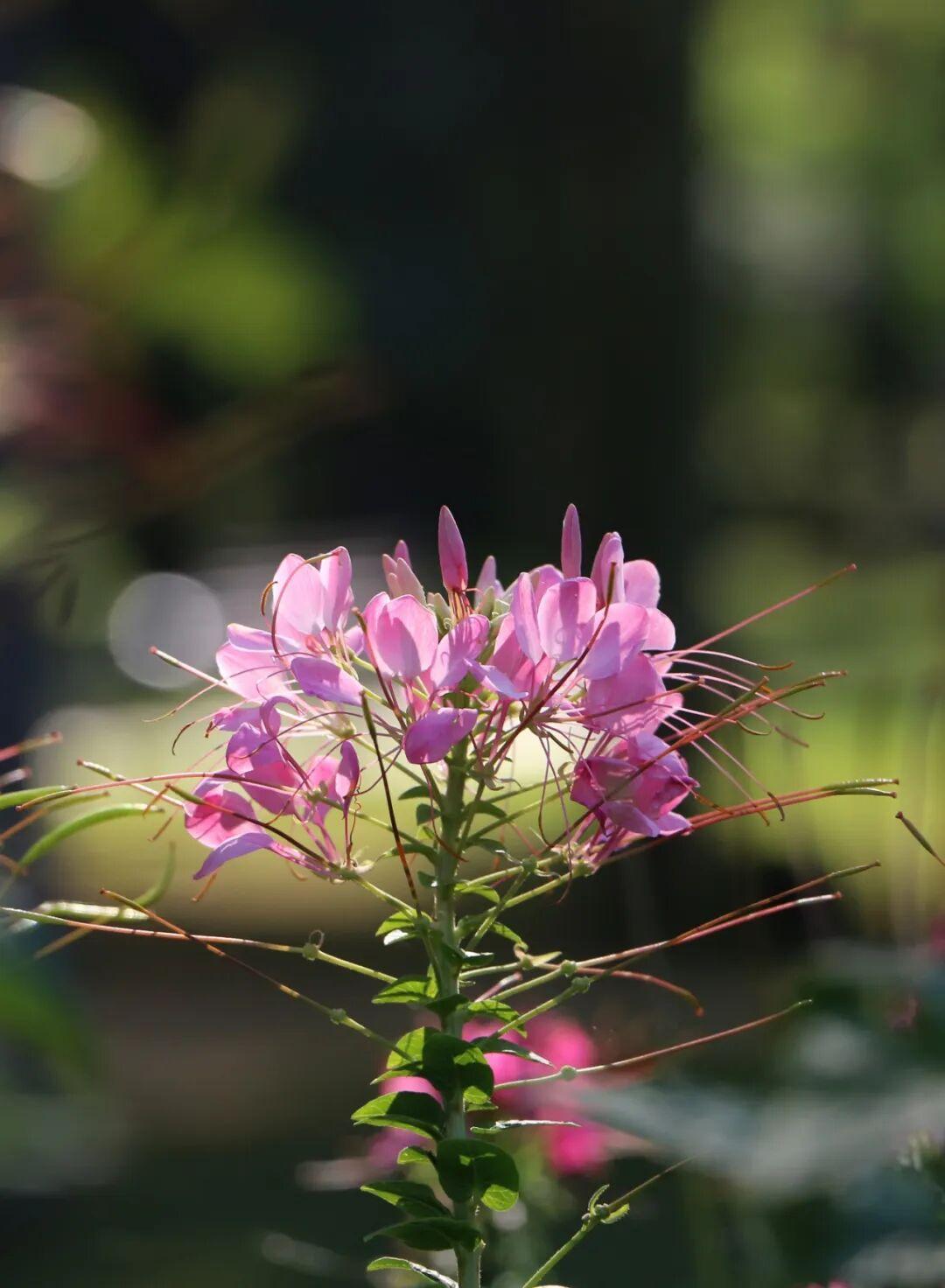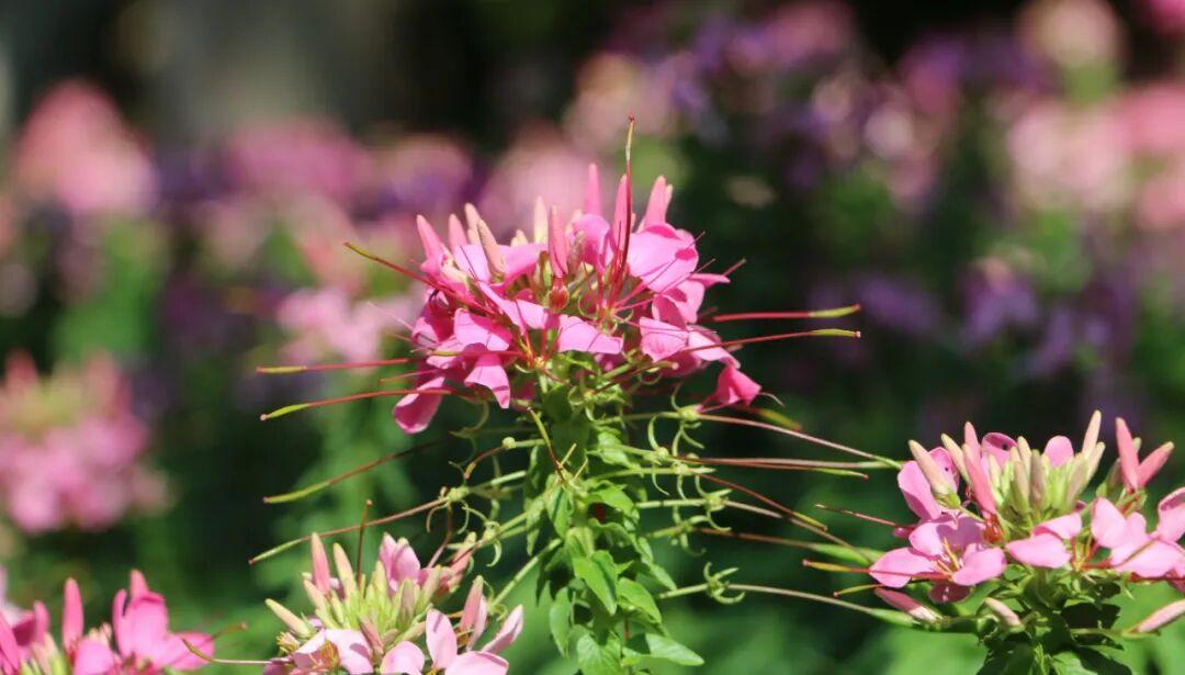 醉蝶花(学名:Tarenaya hassleriana),白花菜科醉蝶花属一年生草本,又名凤蝶草、醉蝴蝶、紫龙须等。掌状复叶,小叶5-7,椭圆状披针形或倒披针形;总状花序,苞片叶状;花瓣呈红、淡红或白色,瓣片倒卵状匙形;果长5-6.5厘米,密布网状纹;种子褐色,径约2毫米,近平滑;花果期3–10月。其花形别致,盛开时雄蕊细长伸出,宛若蝴蝶飞舞,故名“醉蝶”。原产热带美洲,我国多地均有栽植,是优良的观赏和蜜源植物。