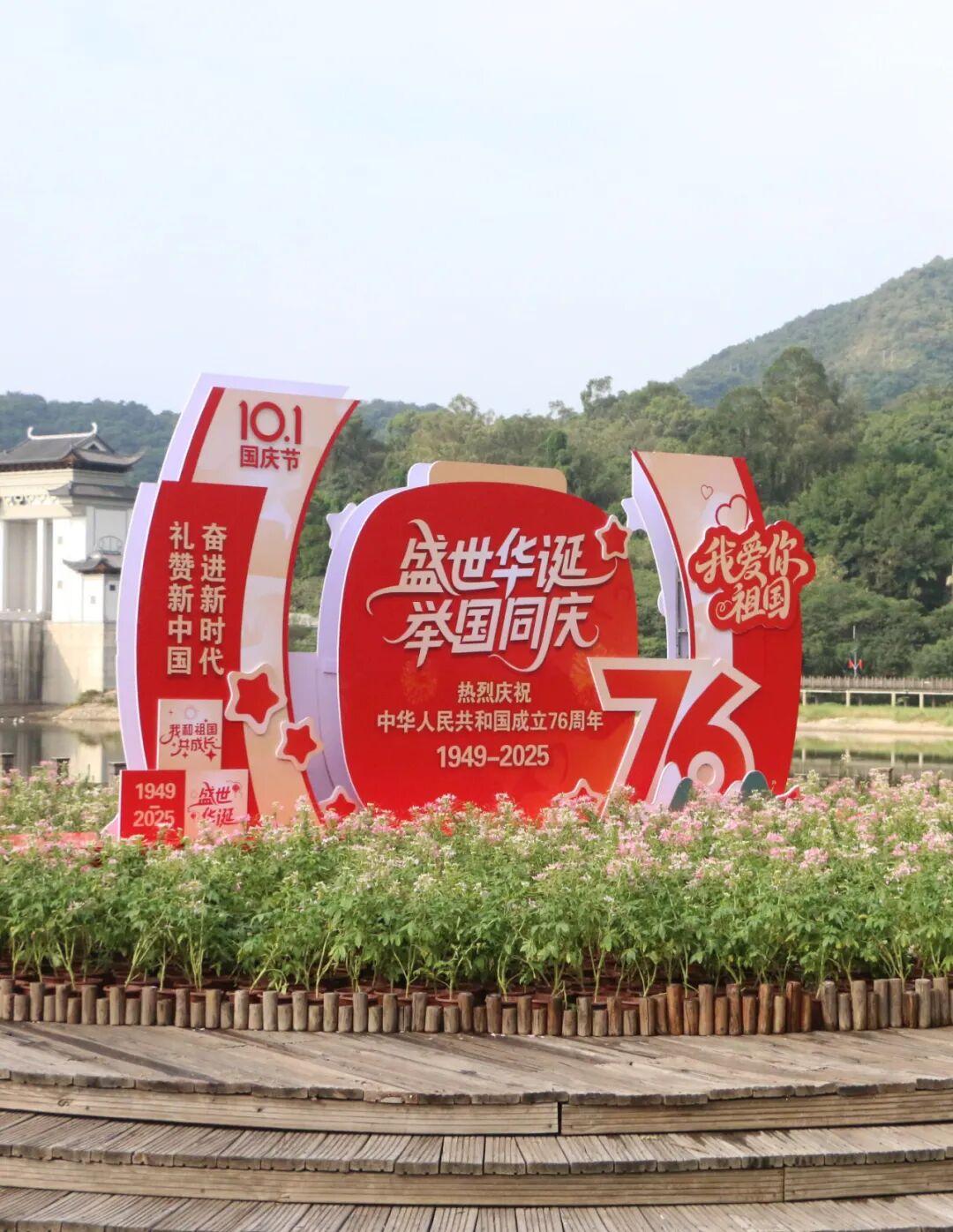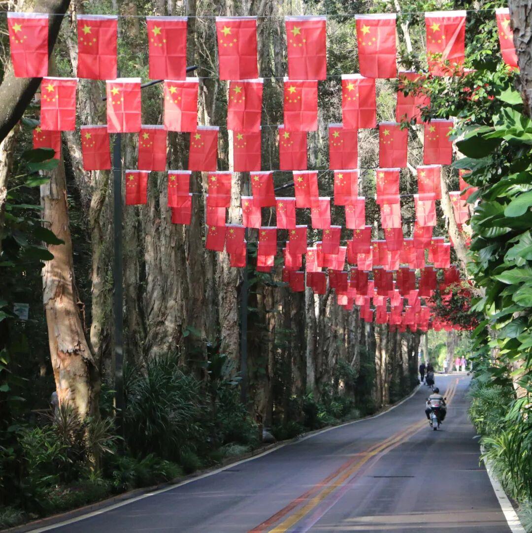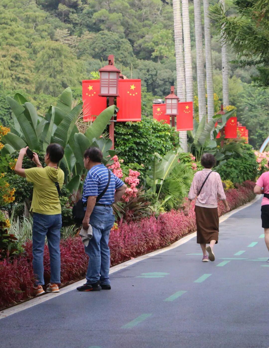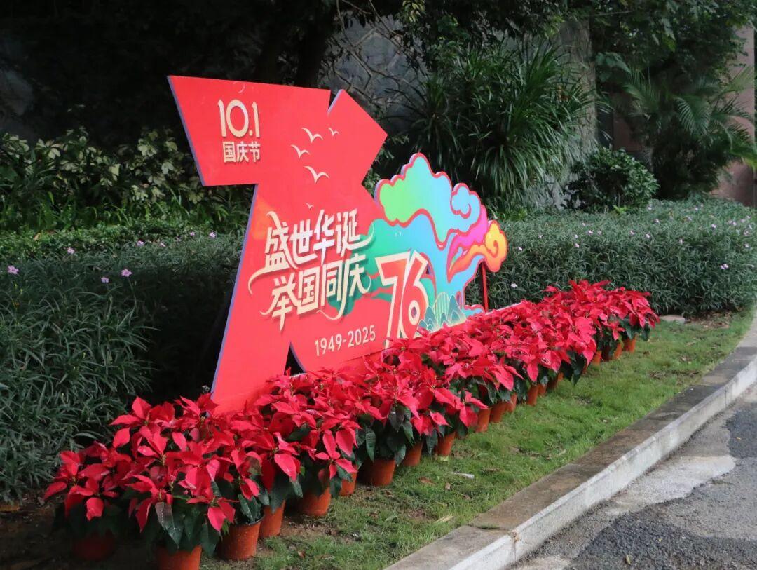步出棕榈园,东门广场上三角梅热烈、醉蝶轻盈、比利时杜鹃娇艳、一品红似火,共谱色彩乐章;环湖路旁,长春花与鸡冠凤尾花蜿蜒铺展,织就斑斓花径;木平台处,“盛世华诞 举国同庆”的字样赫然在目,喜庆氛围流淌其间。夜幕轻抚,花影摇曳,与明月共绘家国同圆的最美画卷。