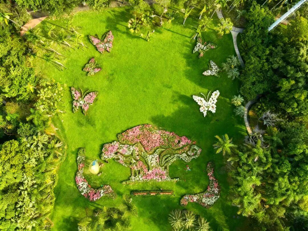 以醉蝶花织就的锦绣“飘带”,轻盈婉转,托起“古榕”的虬枝龙干,其造型精准复刻了园中“榕树王”的磅礴神韵,以花草之意,敬古榕之魂。这不仅是一座用花卉雕琢的生态丰碑,更承载着华夏生态文脉绵延、家国繁荣长青的美好愿景。