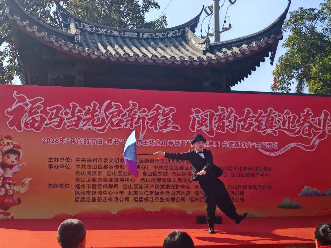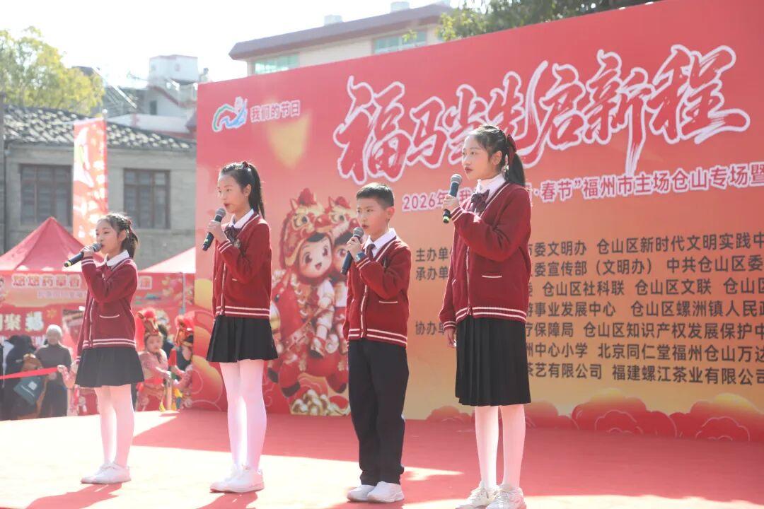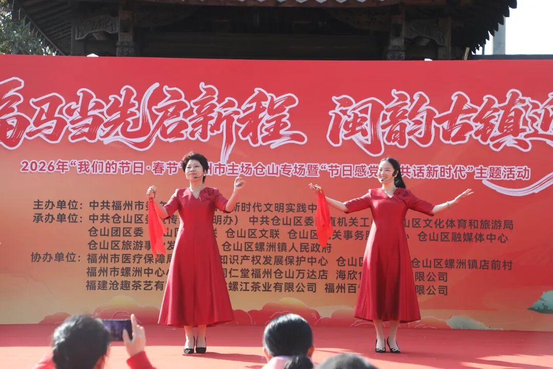 新春启序,福韵满堂。为传承中华优秀传统文化,丰富群众节日文化生活。2026年1月10日上午,由中共福州市委文明办、仓山区新时代文明实践中心主办;中共仓山区委宣传部(文明办)、中共仓山区委区直机关工委、仓山区文化体育和旅游局、仓山团区委、仓山区社科联、仓山区文联、仓山区机关事务服务中心、仓山区融媒体中心、仓山区旅游事业发展中心、仓山区螺洲镇人民政府承办;福州市医疗保障局、仓山区知识产权发展保护中心、仓山区文化馆、仓山区螺洲镇店前村、福州市螺洲中心小学、北京同仁堂福州仓山万达店、海欣食品股份有限公司、福建沧趣茶艺有限公司、福建螺江茶业有限公司、福州百饼园食品有限公司共同协办的“福马当先启新程闽韵古镇迎春归”2026年“我们的节日·春节”福州市主场仓山专场暨“节日感党恩 共话新时代”主题活动在仓山区螺洲广场开展。