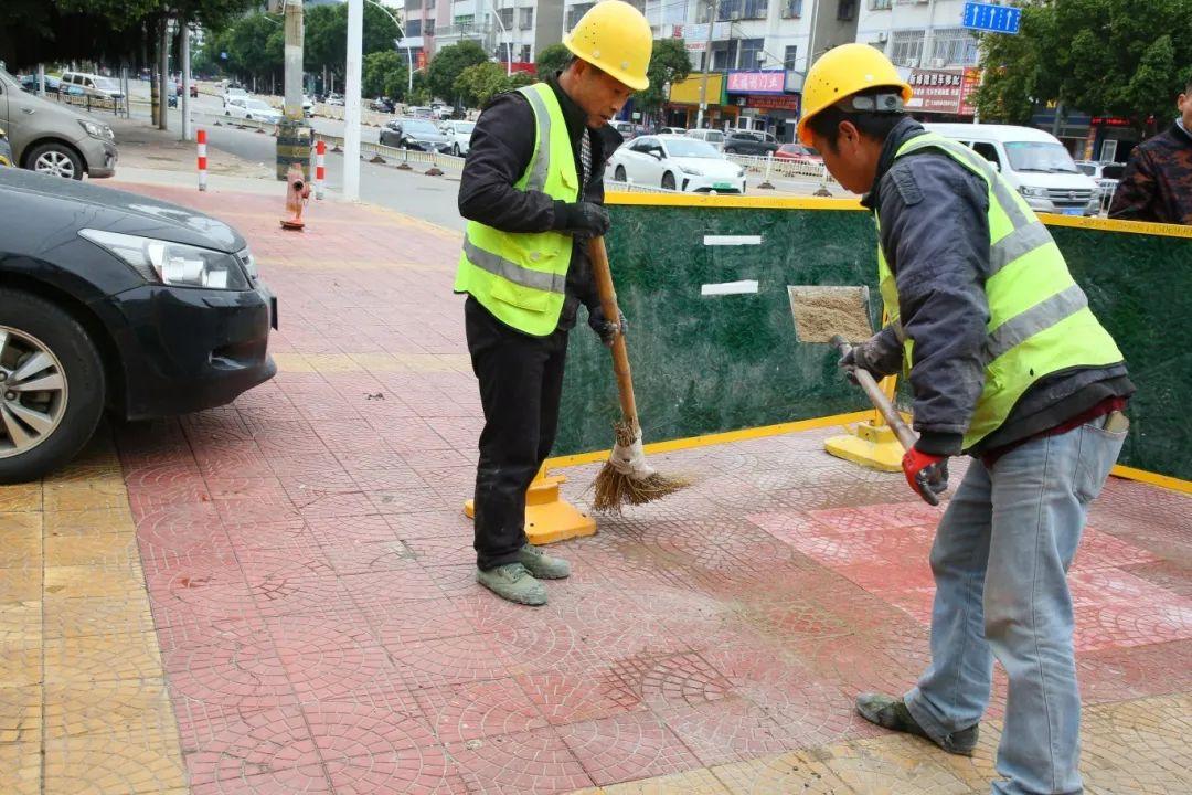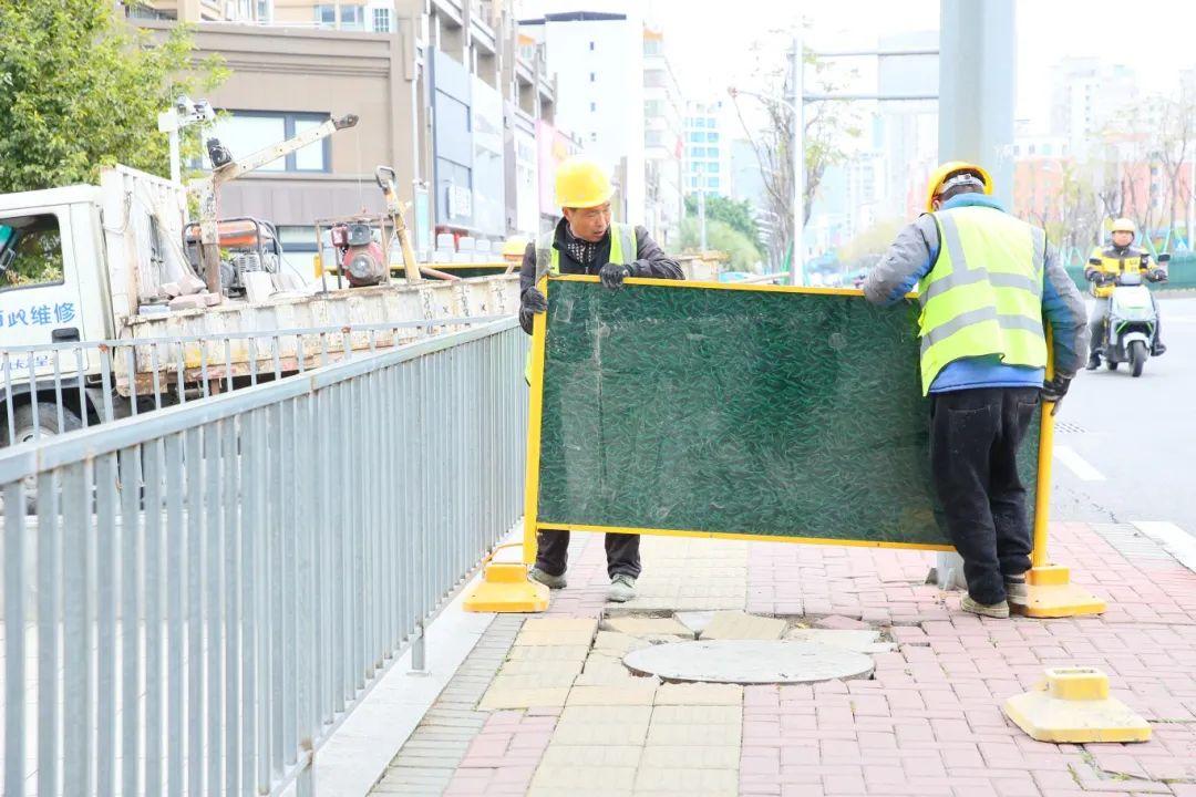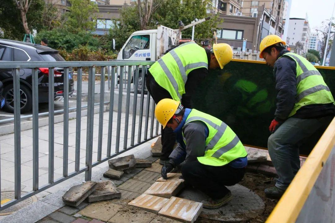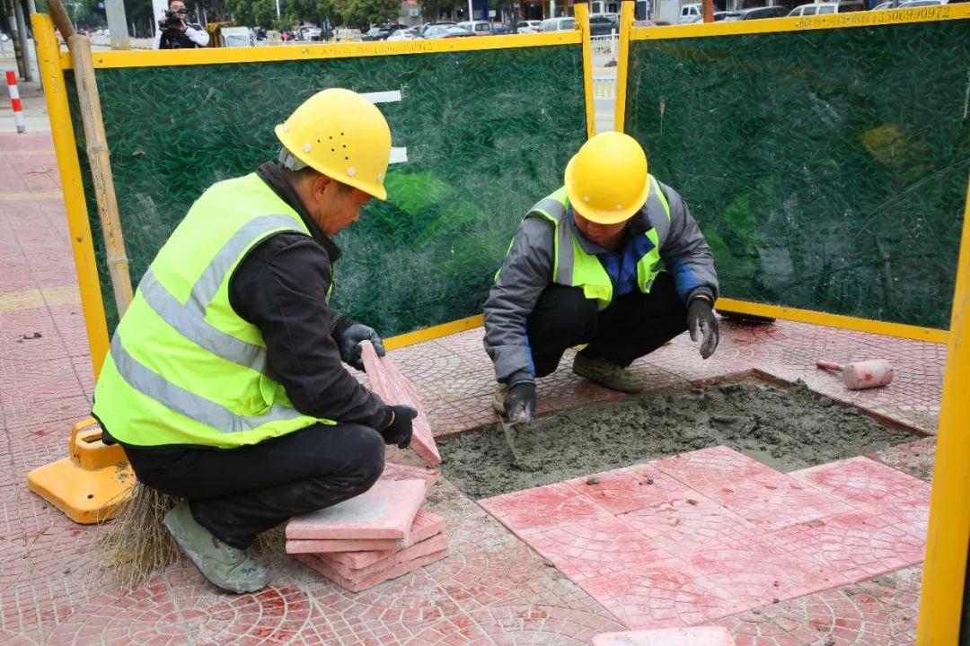 在位于郑和西路长山碧水附近的一处人行道路面维修现场,同样是热火朝天的施工景象,通过加强市政基础设施管养维护力度,持续提升城市道路设施完好率和安全运行率,为群众营造安全舒适的出行环境。