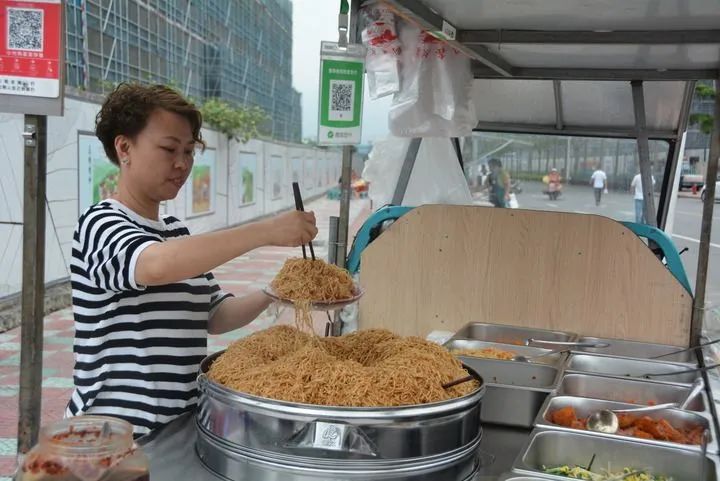 类似这样的“摊规点”还有很多。在厦门市湖里区BRT县后站点附近,一排统一涂装的小餐车形成一道靓丽风景线。每天清晨5点,20多位摊主就陆续“上工”。