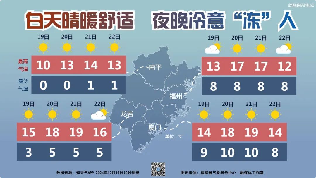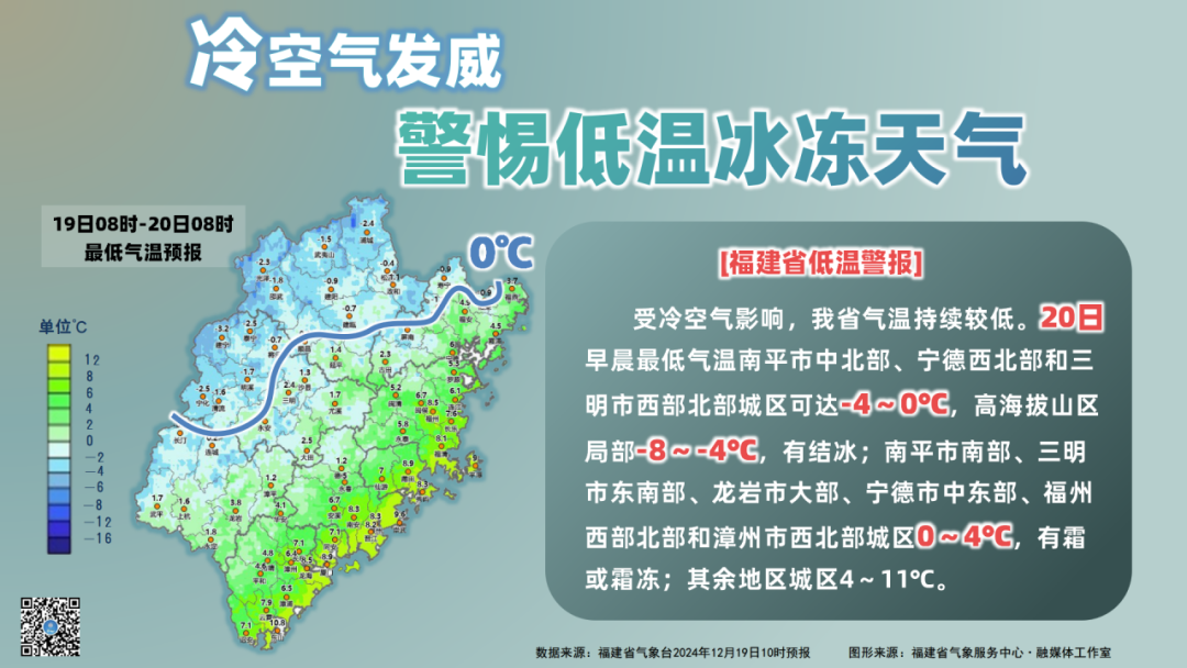 受较强冷空气影响,福建省气温持续较低,20日早晨最低气温南平中北部、宁德西北部和三明西部北部城区可达-4~0℃,高海拔山区局部-8~-4℃,有结冰。南平南部、三明东南部、龙岩大部、宁德中东部、福州西部北部、泉州西北部和漳州西北部城区0~4℃,有霜或霜冻,其余地区城区4~11℃。