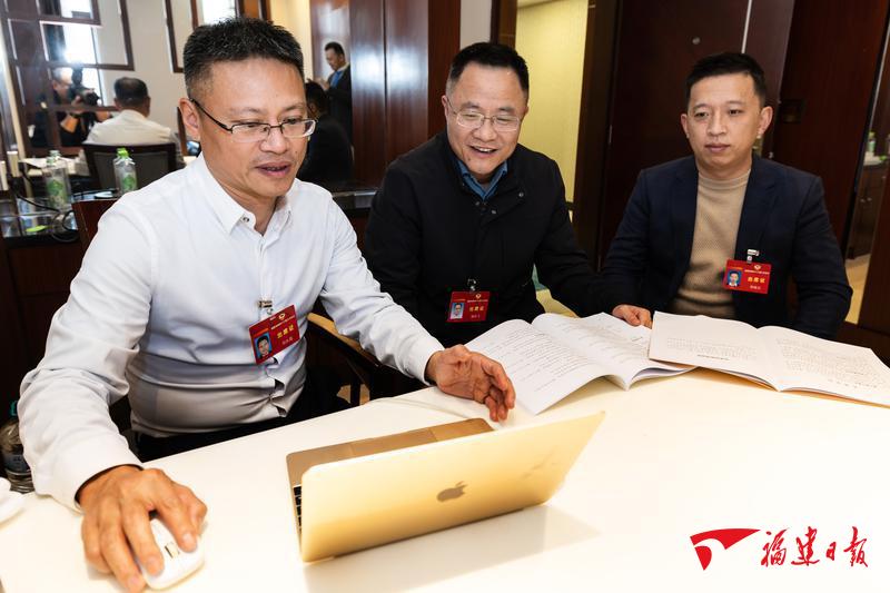 11日,参加省政协十三届三次会议的总工会界别委员邓长昌(左)、农业界别委员蔡风飞(中)、台盟界别委员简继元(右)在驻地完善准备提交的提案。