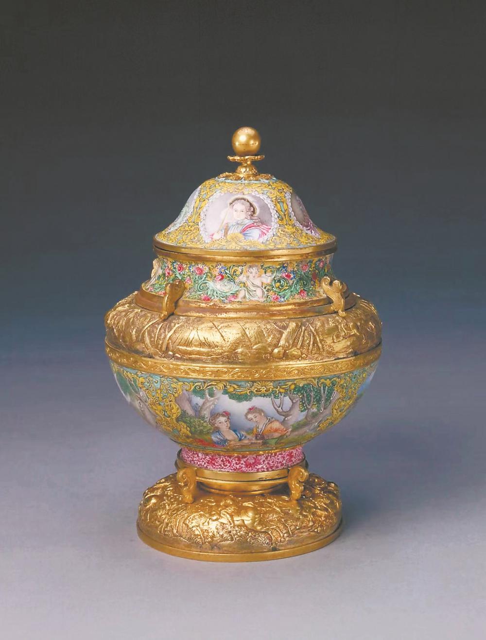 乾隆款画珐琅西洋人物图盖罐。