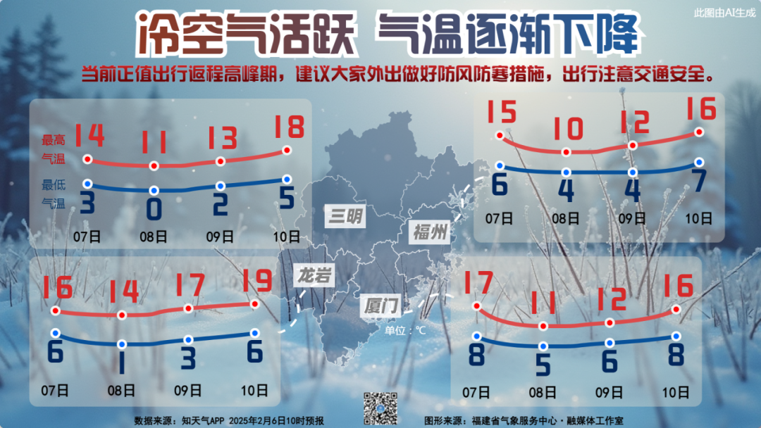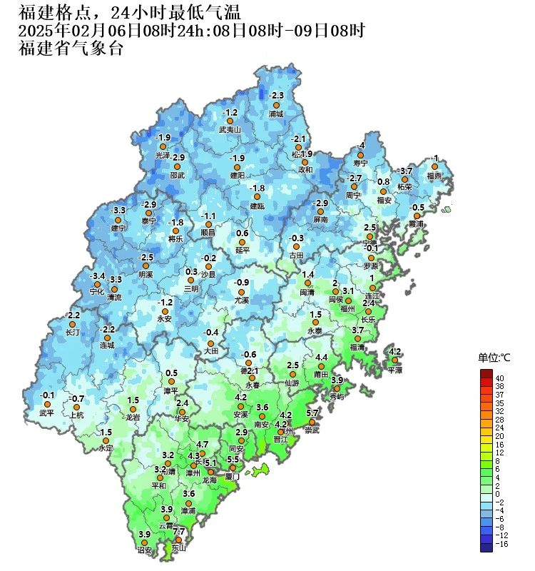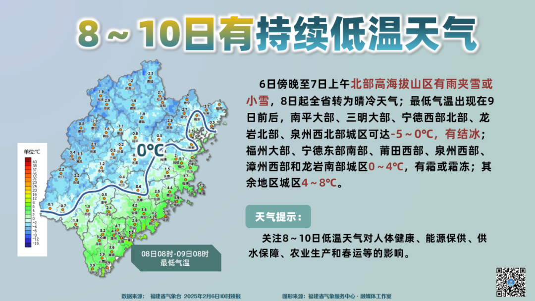 8日起全省转为晴冷天气,最低气温出现在9日前后,南平大部、三明大部、宁德西部北部、龙岩北部、泉州西北部城区可达-5~0℃,有结冰,福州大部、宁德东部南部、莆田西部、泉州西部、漳州西部和龙岩南部城区0~4℃,有霜或霜冻,其余地区城区4~8℃。