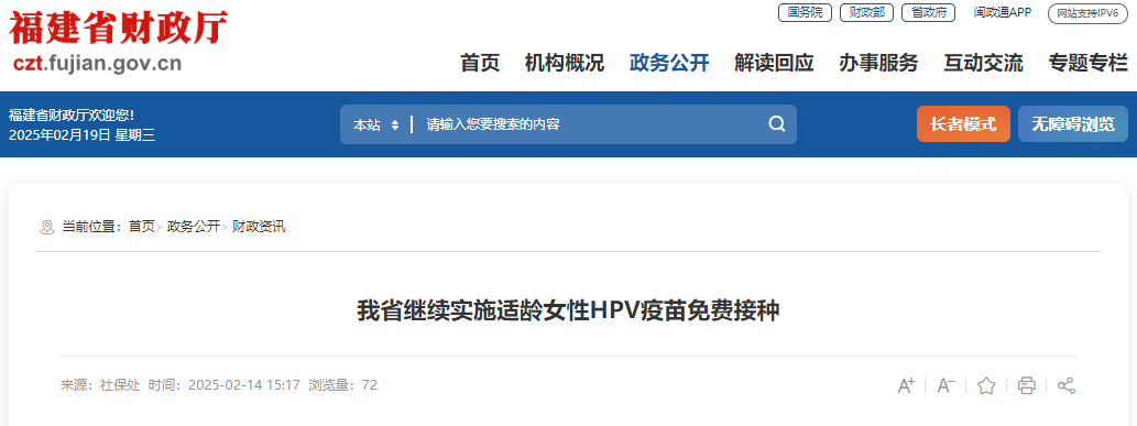 好消息!据福建省财政厅消息,福建继续为适龄女性免费接种人乳头瘤病毒(HPV)疫苗。