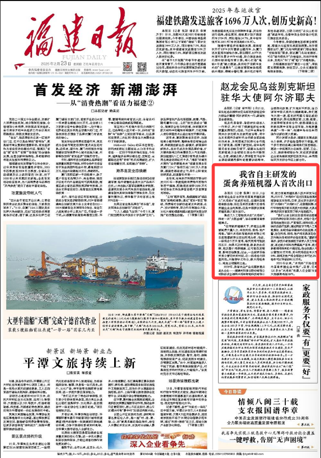 22日,2台由福建省企业自主研发的蛋禽养殖机器人“木鸡郎6”完成打包后,在福州马尾港装船出海,运往马来西亚最大的蛋鸡养殖企业全利集团。这是中国原创蛋禽养殖机器人首次出口。