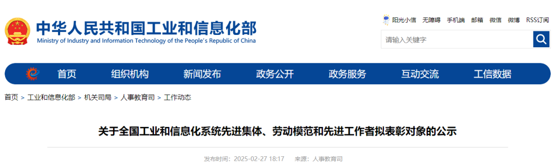 2月27日,工业和信息化部官网发布公示,拟表彰全国工业和信息化系统292个先进集体、373名劳动模范和91名先进工作者。其中,福建12个集体、20名个人入选。公示期为2025年2月28日至3月6日。