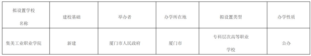 根据《中华人民共和国高等教育法》《普通高等学校设置暂行条例》《高等职业学校设置标准(暂行)》等有关规定,经福建省高等学校设置评议委员会专家考察和评议,现将拟设置集美工业职业学院事项予以公示。
