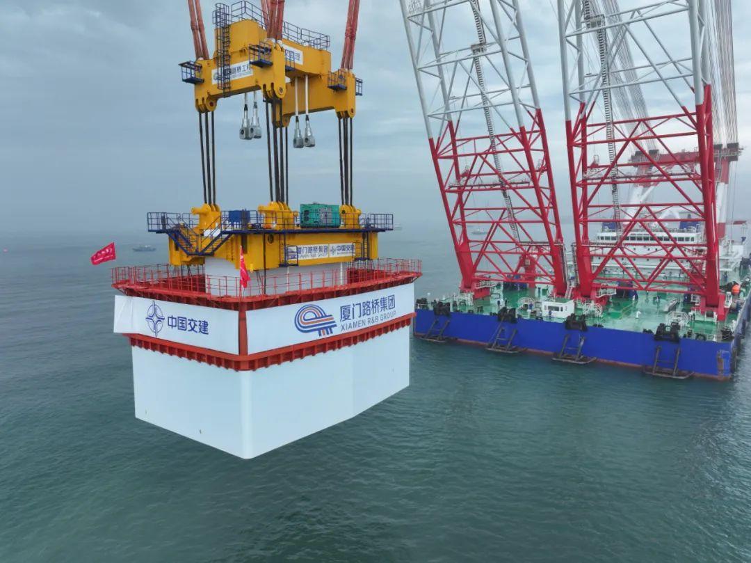 厦金大桥(厦门段)项目首个预制墩台的高精度吊装,验证了项目智能建造装备的适用性,为后续海上大规模预制墩台连续安装作业提供了标准化技术示范。