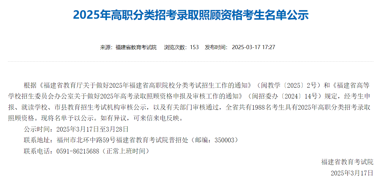 17日,福建省教育考试院发布2025年高职分类招考录取照顾资格考生名单公示,1988名考生拟获高职分类招考录取照顾资格↓↓