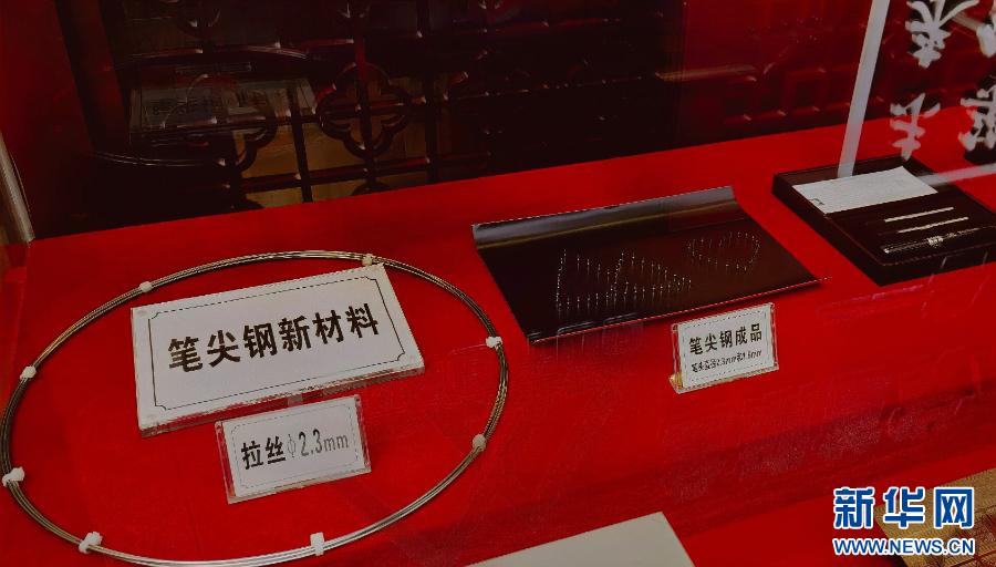 青拓集团展厅里展示的笔尖钢新材料。新华网 刘丰 摄