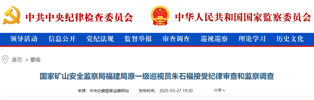 据中央纪委国家监委驻应急管理部纪检监察组、福建省纪委监委消息:国家矿山安全监察局福建局原一级巡视员朱石福涉嫌严重违纪违法,目前正接受中央纪委国家监委驻应急管理部纪检监察组纪律审查和福建省龙岩市监察委员会监察调查。