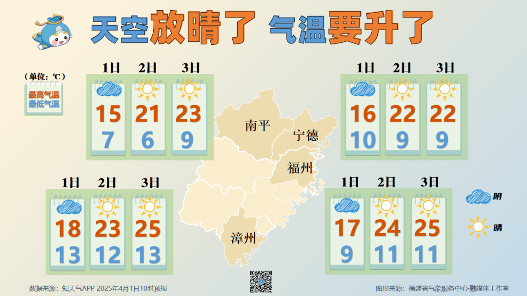 随着天气转晴,气温开始快速上升,预计4月2日福建省大部分地方最高气温将升至25℃左右,但夜晨气温仍然较低,昼夜温差大,朋友们需根据气温变化及时增减衣服,谨防感冒。