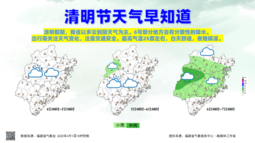 清明假期,福建省以多云到阴天气为主,6日部分地区有分散性降水,朋友们出行需关注天气变化,注意交通安全。