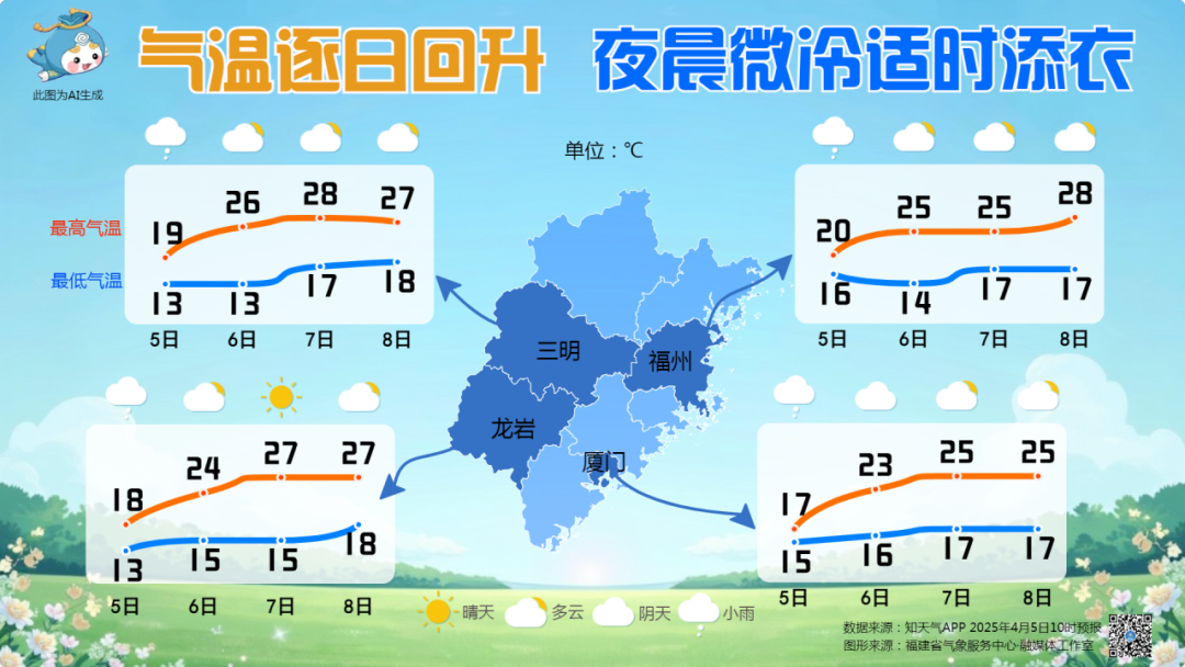 气温方面,未来随着暖湿气流的增强,不论是高温还是低温,都将呈现逐日回升的态势,最高气温将升至25℃以上。