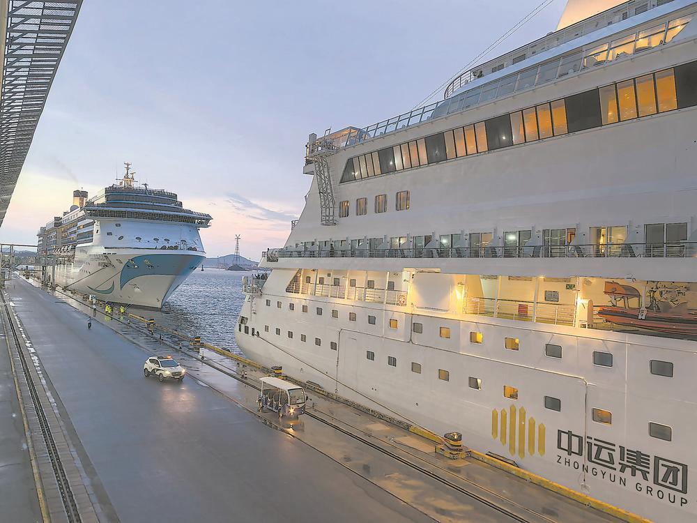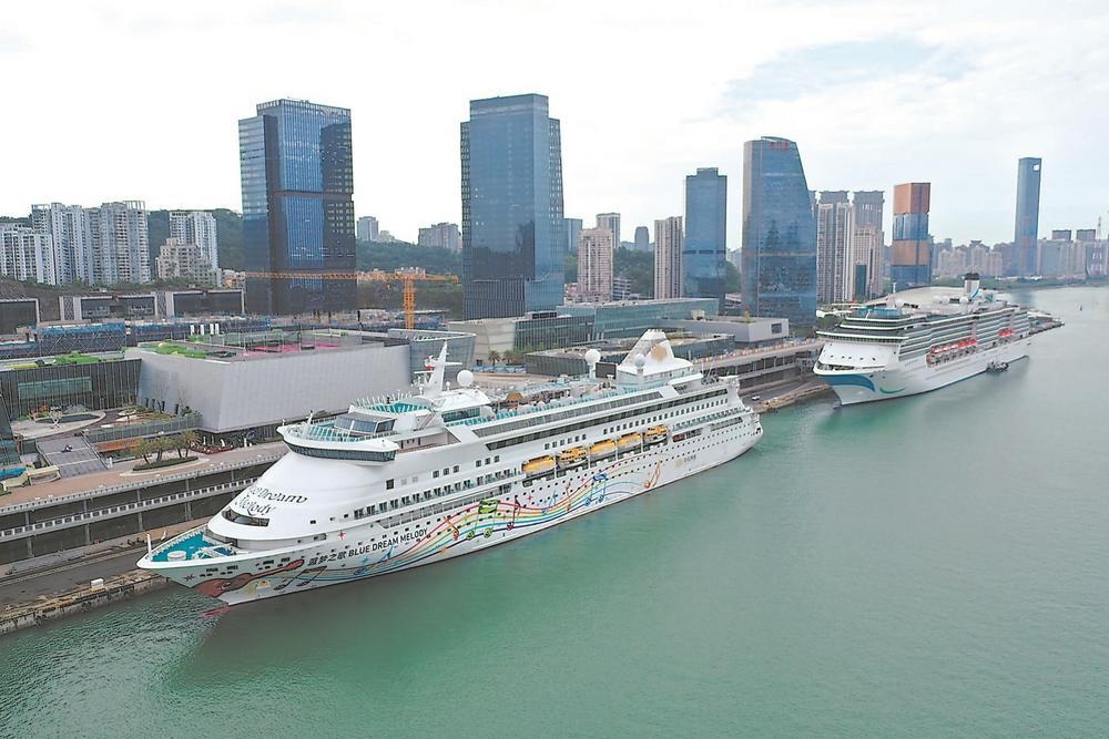 “蓝梦之歌”号邮轮(左)与“爱达·地中海号”邮轮停靠在厦门国际邮轮中心。(高崎边检供图)