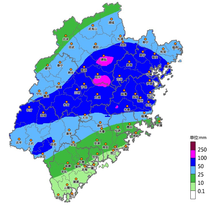 24日,福州大部三明(将乐、宁化、清流、明溪、永安、尤溪、三元、沙县、大田)南平(建瓯、顺昌、政和、延平)宁德(周宁、福安、屏南、古田、蕉城、寿宁、霞浦)龙岩(长汀、连城、武平、漳平、新罗、上杭、永定)莆田(仙游)、泉州(德化)有暴雨,局部大暴雨,其余地区有中到大雨,局部暴雨,24小时累计雨量50~80毫米,局部140毫米,最大小时雨量70毫米,雷雨时局地伴有短时强降水、8~10级大风或冰雹等强对流天气。