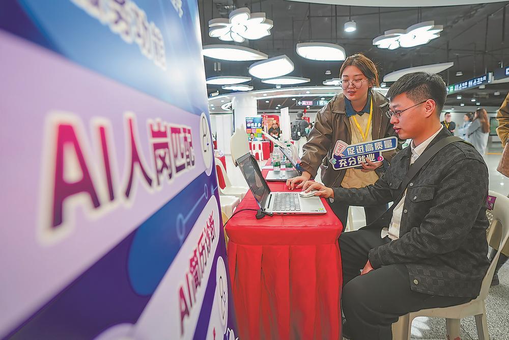 日前,在福州南门兜地铁站举行的招聘现场会上,工作人员利用AI技术和大数据分析等先进技术,为求职者提供智能化的岗位匹配,实现“云端招聘”。通讯员 谢贵明 摄