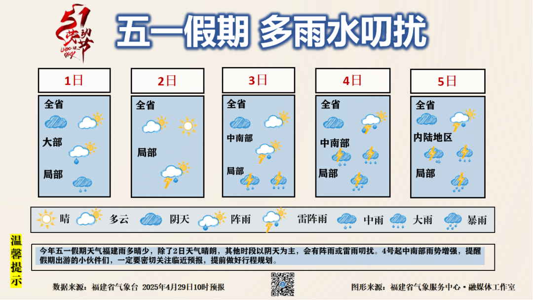 5月1日,全省多云到阴天,大部有阵雨,局部中雨。2日天气晴好。3日,受冷空气南下影响,雨水开始发展。4日,阵雨或雷雨会在全省铺展,中南部雨势增强,部分县市有中到大雨,局部暴雨。