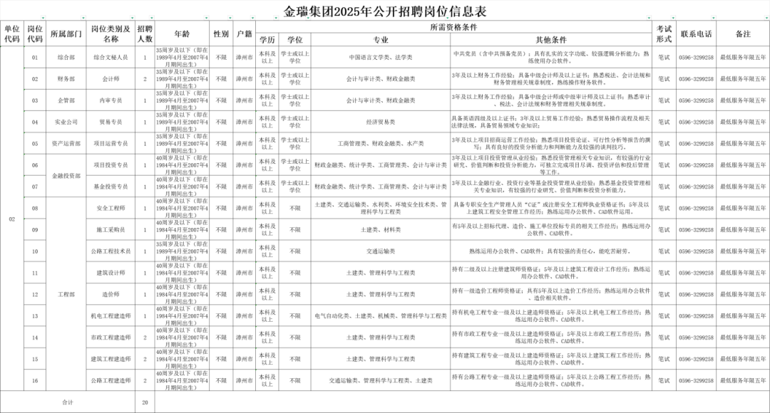 漳浦金瑞投资有限公司2025年公开招聘工作人员20名