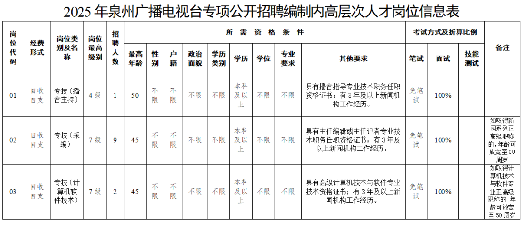 泉州广播电视台公开招聘具有副高及以上专业技术职务任职资格人员12名