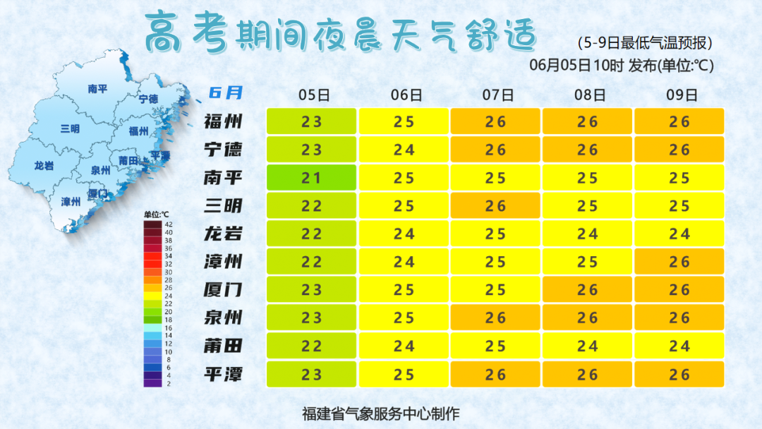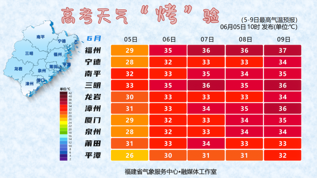 今年高考期间(7-9日)福建多雷雨天气,气温较高,福州、三明、漳州可能突破35℃,其他地区32℃左右,由于湿度较高,体感闷热,很容易中暑,要小心防范。
