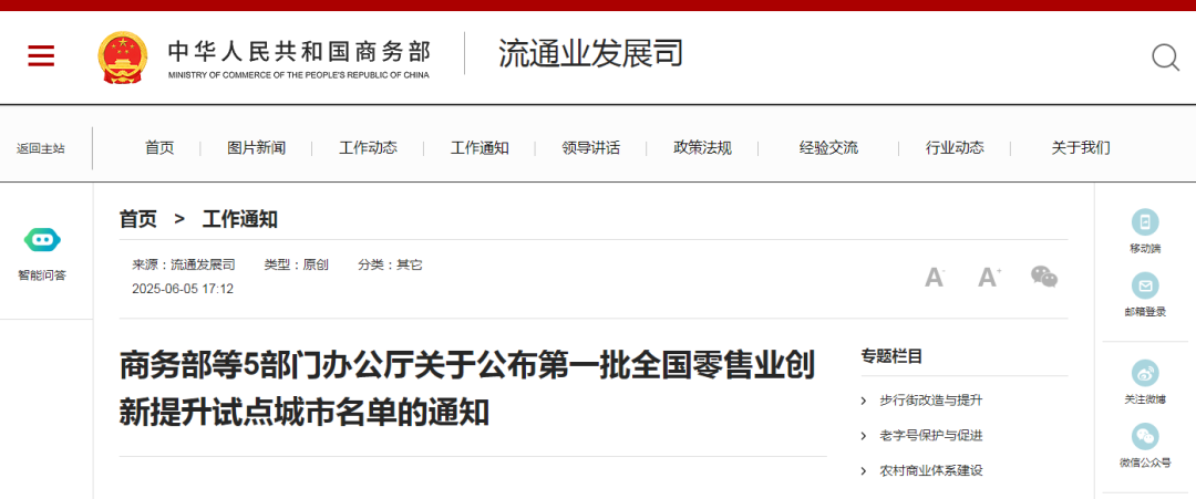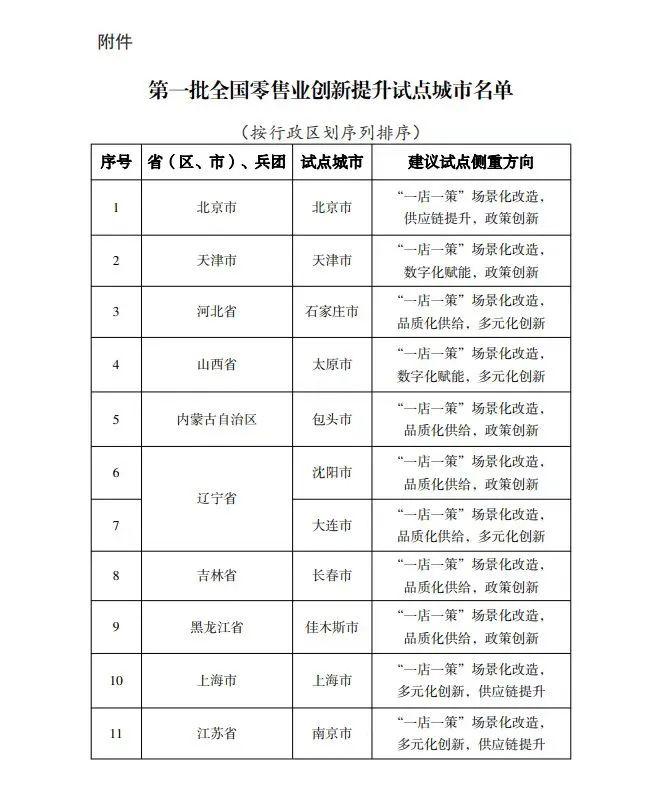根据《商务部等7部门办公厅关于印发<零售业创新提升工程实施方案>的通知》的要求,在各地申报试点的基础上,经专家评审并向社会公示,确定第一批共38个全国零售业创新提升试点城市。