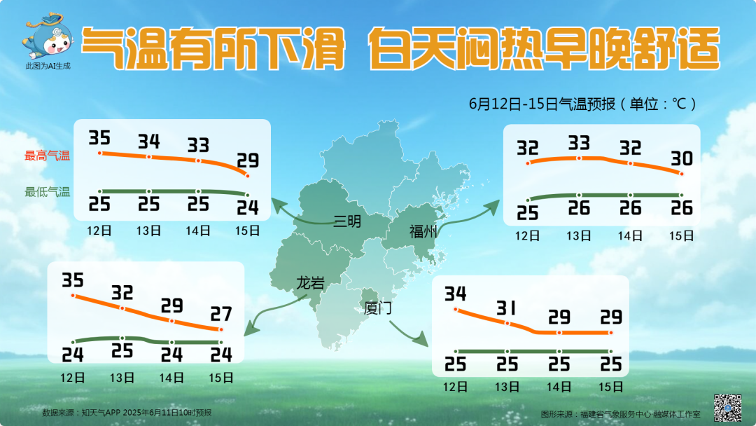 12日,雨势有所减弱,全省阴到多云,大部有阵雨或雷阵雨,沿海地区部分中到大雨,局部暴雨。