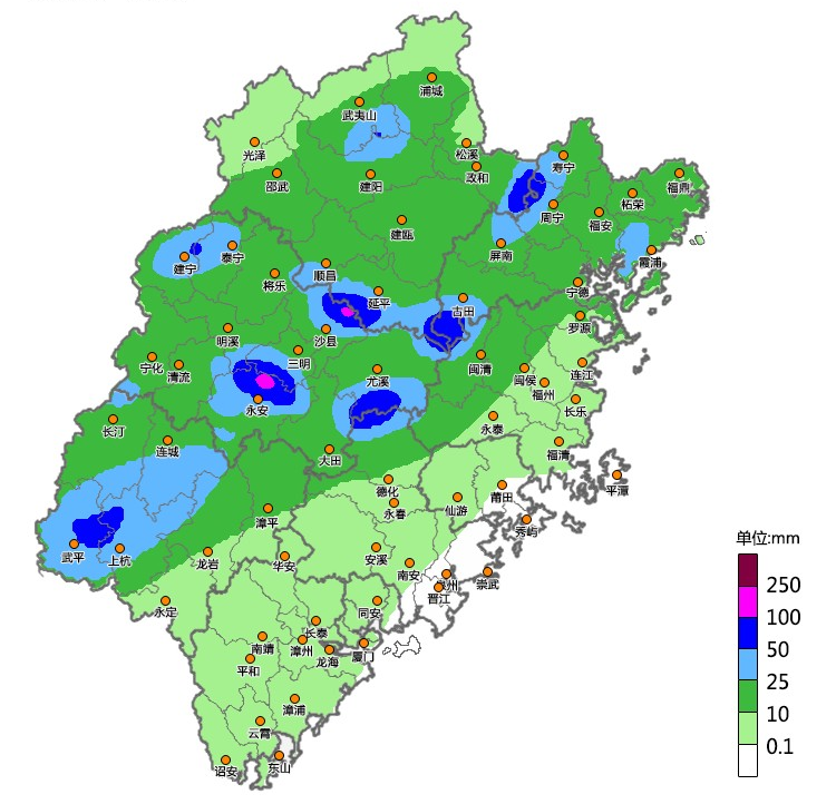 11日,全省大部有中到大雨,其中三明(泰宁、尤溪、三元、沙县、永安)南平(政和、延平)、龙岩(上杭、武平)宁德(周宁、古田)、福州(闽清)、泉州(德化)有分散性暴雨,局部大暴雨,其余地区局部有暴雨,24小时累计雨量50~80毫米,局部120毫米,最大小时雨量可达80毫米,雷雨时局地伴有短时强降水、7~10级大风等强对流天气。