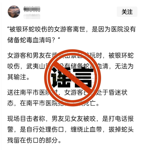 近日,一网民在某网络平台发布信息称:“一女游客和男友在武夷山景区游玩时,被银环蛇咬伤,武夷山医院没有储备蛇毒血清,无法为其输注。送往南平市医院时,女游客已经处于昏迷状态,在南平市医院抢救无效死亡。”