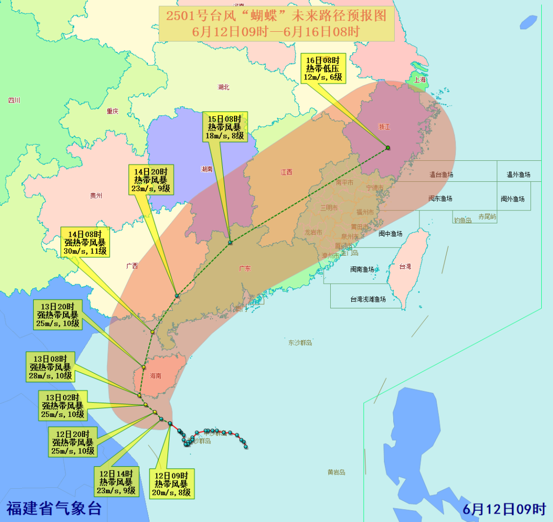 今年第1号台风“蝴蝶”12日09时距离海南省三亚市东南方向约155公里(北纬17.1度、东经110.3度),中心附近最大风力8级(20米/秒,热带风暴级)。