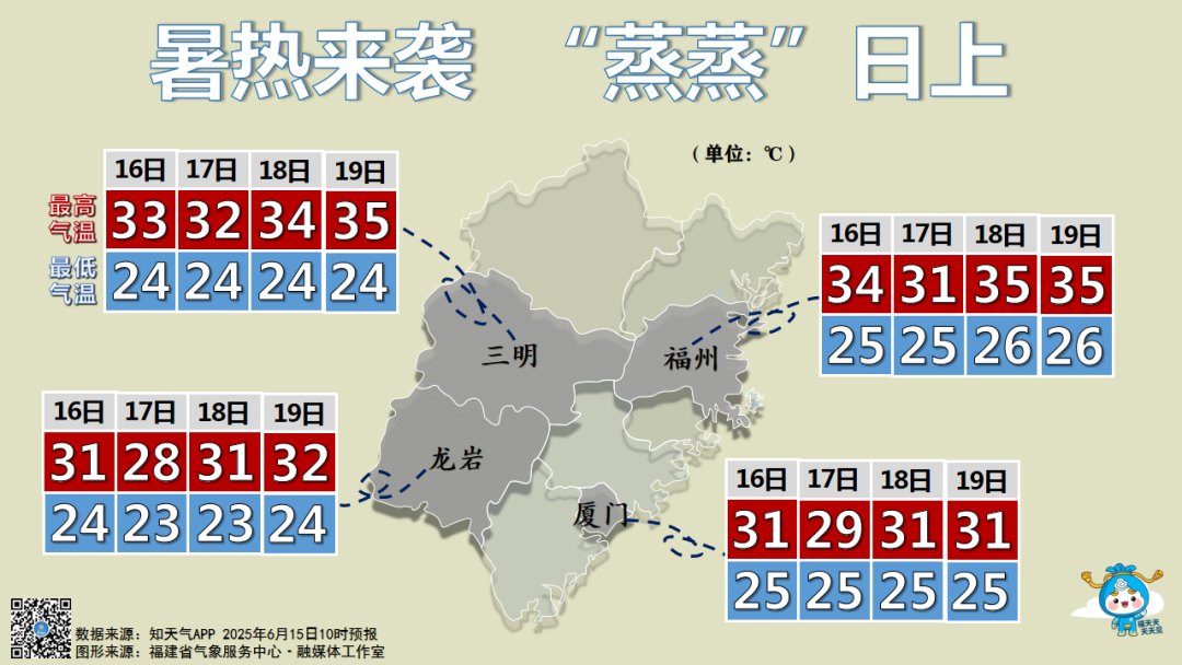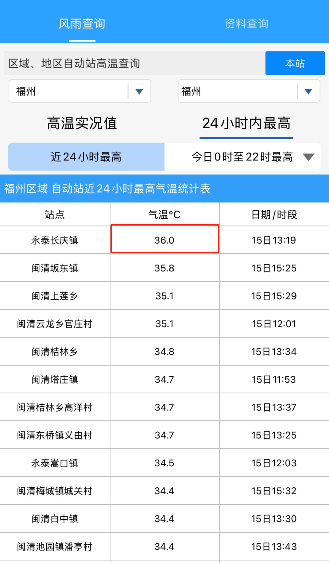 15日,福州多个气象站点气温实况值突破35℃,其中,永泰长庆镇最高温达36℃。